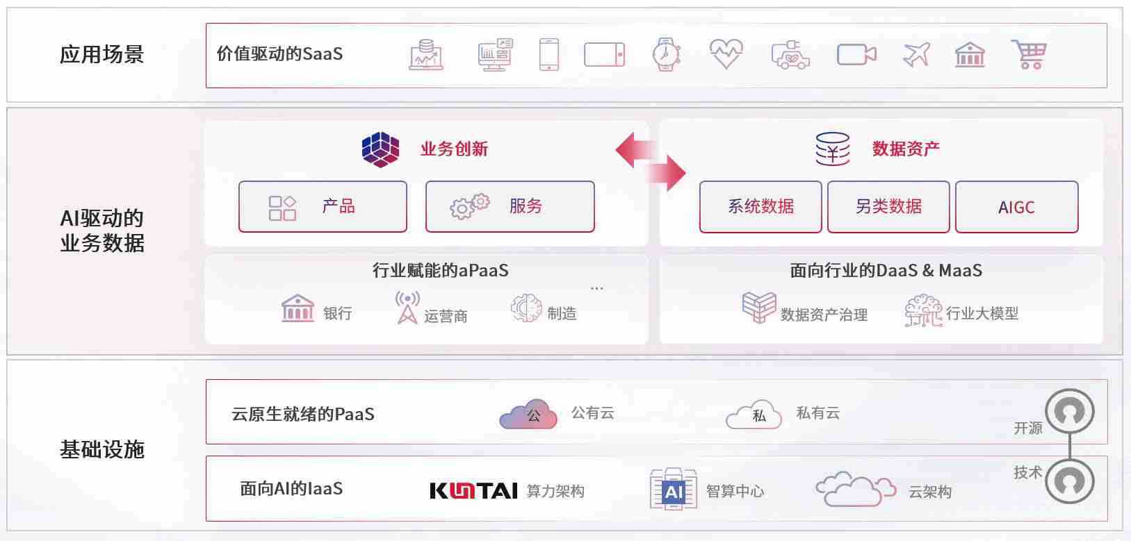 数字时代,,,,围绕企业数字化转型的关键要素,,,亚洲胜游数码开创性的提出数云融合战略和技术体系框架,,,,着力在云原生、、数字原生、、AI原生和信创产业上架构产品和服务能力,,为处在不同数字化转型阶段的快消零售、、、、汽车、、、、金融、、、、医疗、、、政企、、、、教育、、、、运营商等行业客户提供泛在的敏捷IT能力和融合的数据驱动能力,,,构建跨界融合创新的数字业务场景和新业务模式,,,,助力企业级客户建立面向未来的核心能力和竞争优势,,,全面推动社会的数字化、、、智能化转型升级。。。。